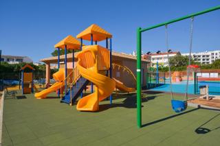 A colourful splash zone with mini slides and water features, all on a soft, non-slip surface. There’s also a shaded baby pool for the youngest guests. - Playgrounds: