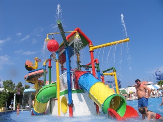 The water park has many different areas: calm pools for the babies and toddlers, castles inside the water that they can climb and go down in fun and kid-friendly slides for the 3-7 aged kids and faster and taller water slides and attractions for the bigger kids and adults. It has green places as well where you can rest under the nice shade of the trees.